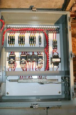 30" x 24" x 10" Enclosure box with circuits to independently start and stop three 2 horse power, 3 phase motors. There is circuits for 2 SCR drives with jumpers to bypass the SCR circuits. The box weighs 120 lb and local pickup is an option.
