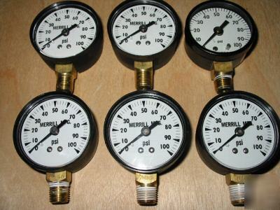 THESE ARE FROM A SALVAGE LOSS AND WERE INSTALLED ON SOME WATER FILTER SYSTEMS THAT WERE DAMAGED AND SCRAPED. OTHER WISE NEW CONDITION. INCLUDES 5 PLASTIC MERRILL MFG PRESSURE GUAGES 0 - 100 PSI. AND 1 METAL ASHCROFT PRESSURE GUAGE 0 - 100 PSI. 6 TOTAL. I THINK THEY ARE 1/4" PT.