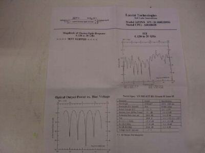 1000 units of new in box lucent 2623na 10 Gbits/s Lithium Niobate optical intensity modulator. Electro-Optic Modulator Features Ti-diffusion process Single-drive technology Operation at 1.55mm wavelength Slim, hermetic package Bandwidths up to 20 GHz Operational over a temperature range of 0C to 70C 43W design for minimal electrical reflections Angled interfaces for minimal optical reflections Integrated optical attenuator available on 10 Gbits/s modulator (2623NA) Tested to Bellcore 468 Benefits Excellent long-term bias stability Internal polarizer Low modulation voltages Applications Digital high-speed telecommunications — SONET: OC-1 through OC-192 — SDH: STM-16, STM-64 — Undersea communications Internet data communications SONET/SDH test equipment The Lithium Niobate Modulators include a single-drive modulator (2623CS) and a single-drive modulator with an integrated attenuator (2623NA). Both devices are capable of modulation rates up to 10